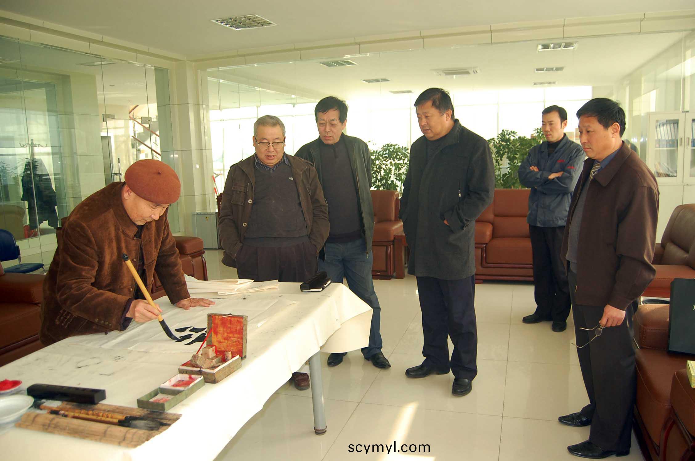 圖爲公司董事長、總經(jing)理(li)康鳳明、副總經理郭傢榮等領導(dao)現場觀看耿老作書(shu)。